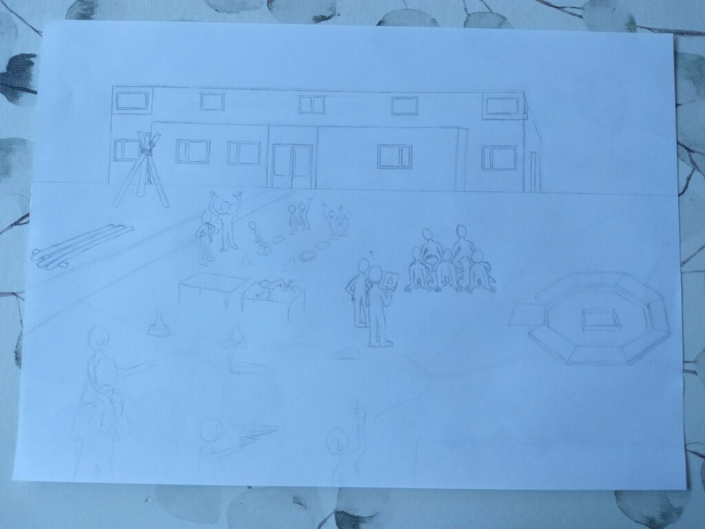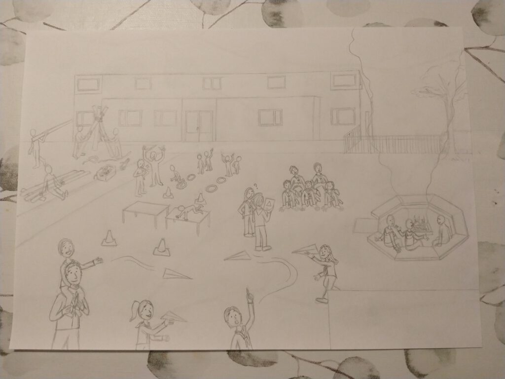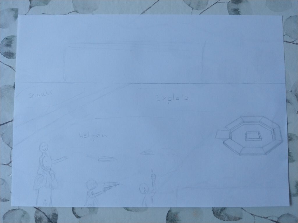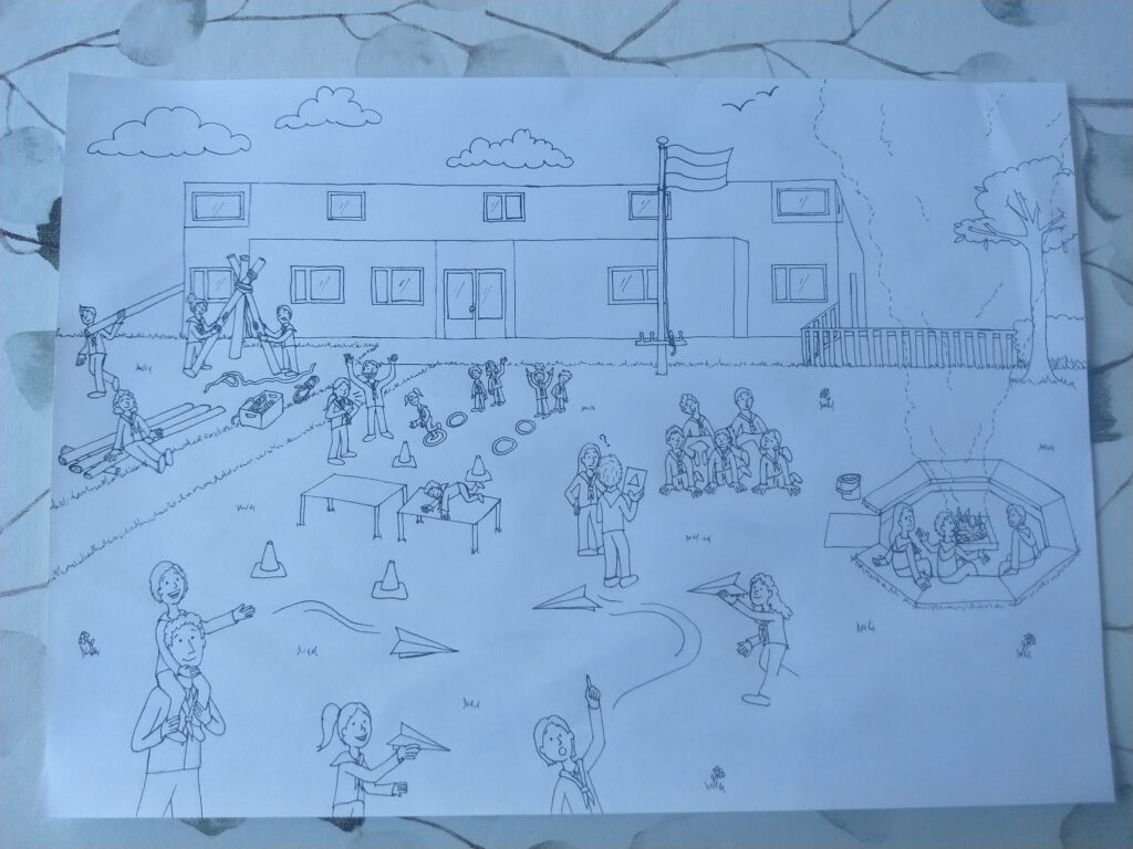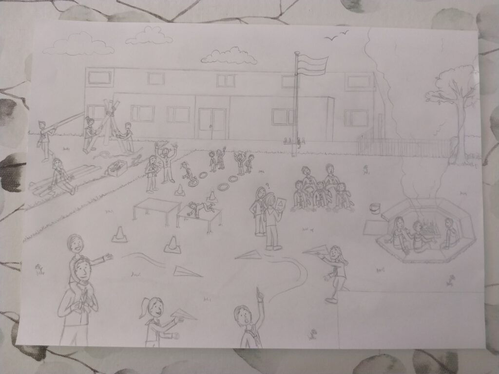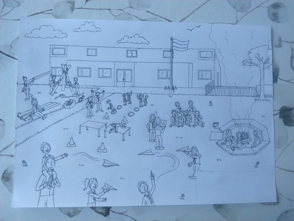 Ik wilde de belangrijkste speltakken er in verwerken, van Bevers tot en met Pivo’s. Dit zijn de leeftijden van 5 tot en met 23 jaar. Iedere speltak heb ik een activiteit laten doen die goed bij die leeftijd past. Het gebouw, de kampvuurplaats en de omgeving heb ik zo goed als na-geprobeerd te tekenen van de realiteit.