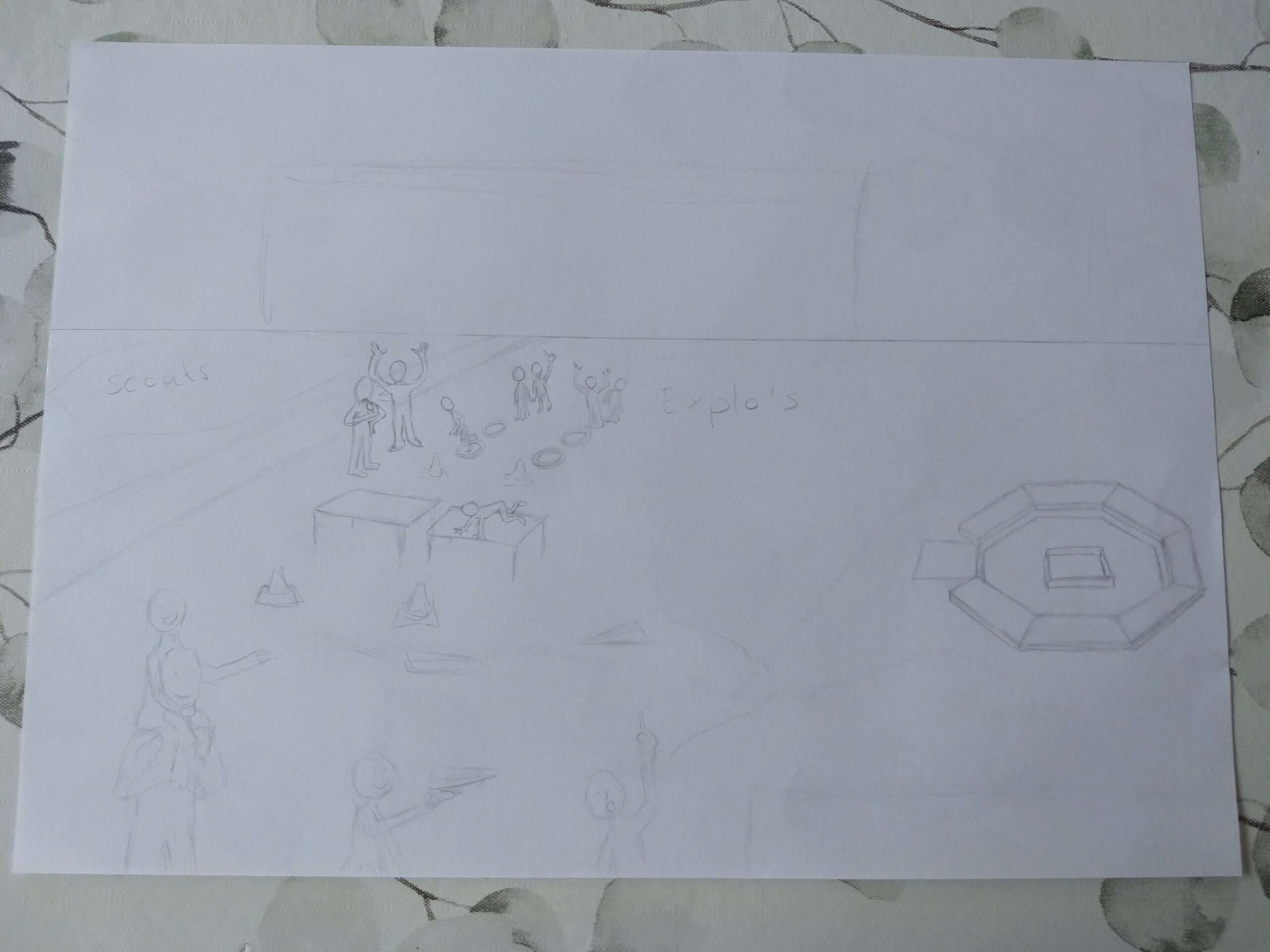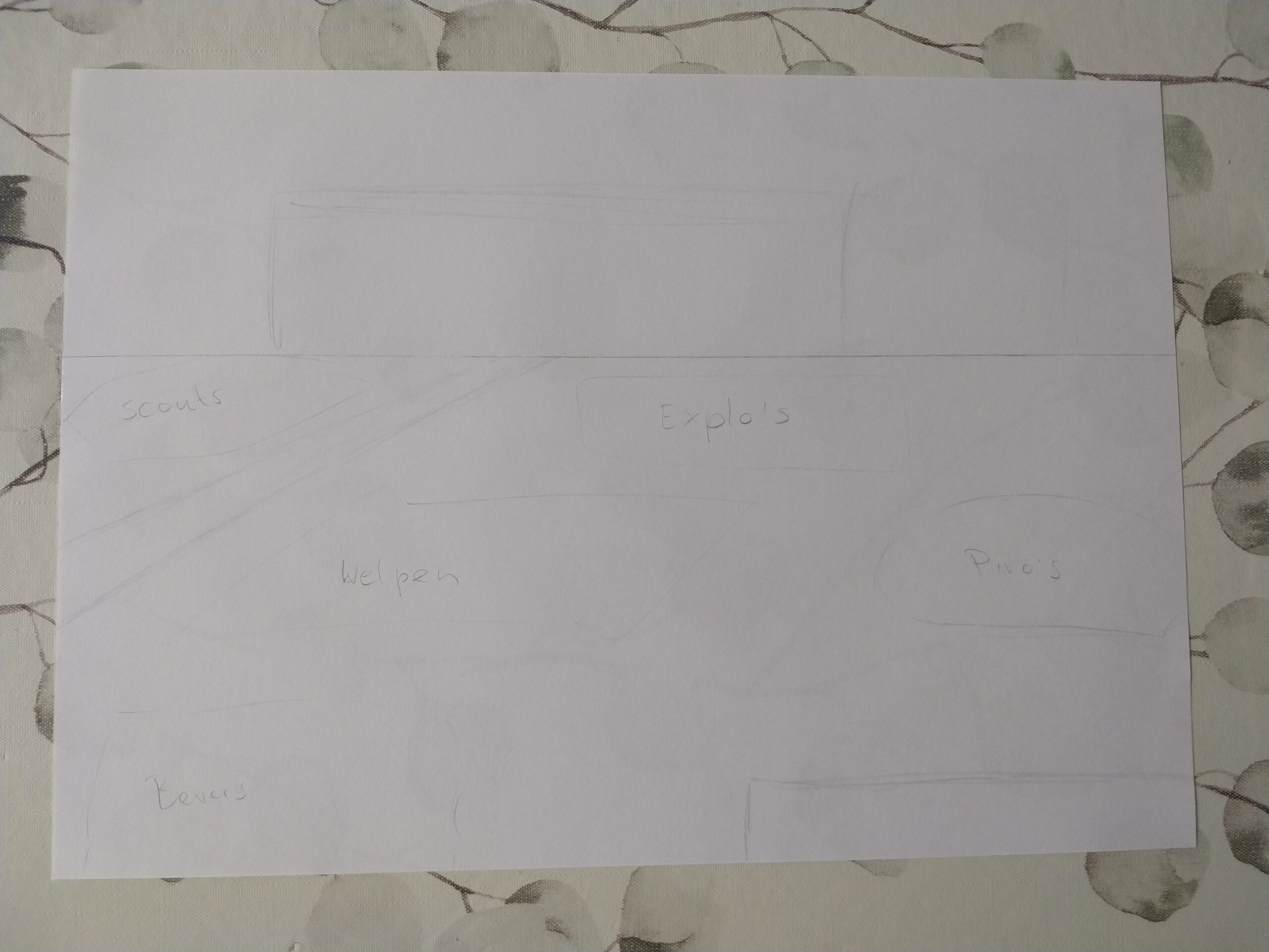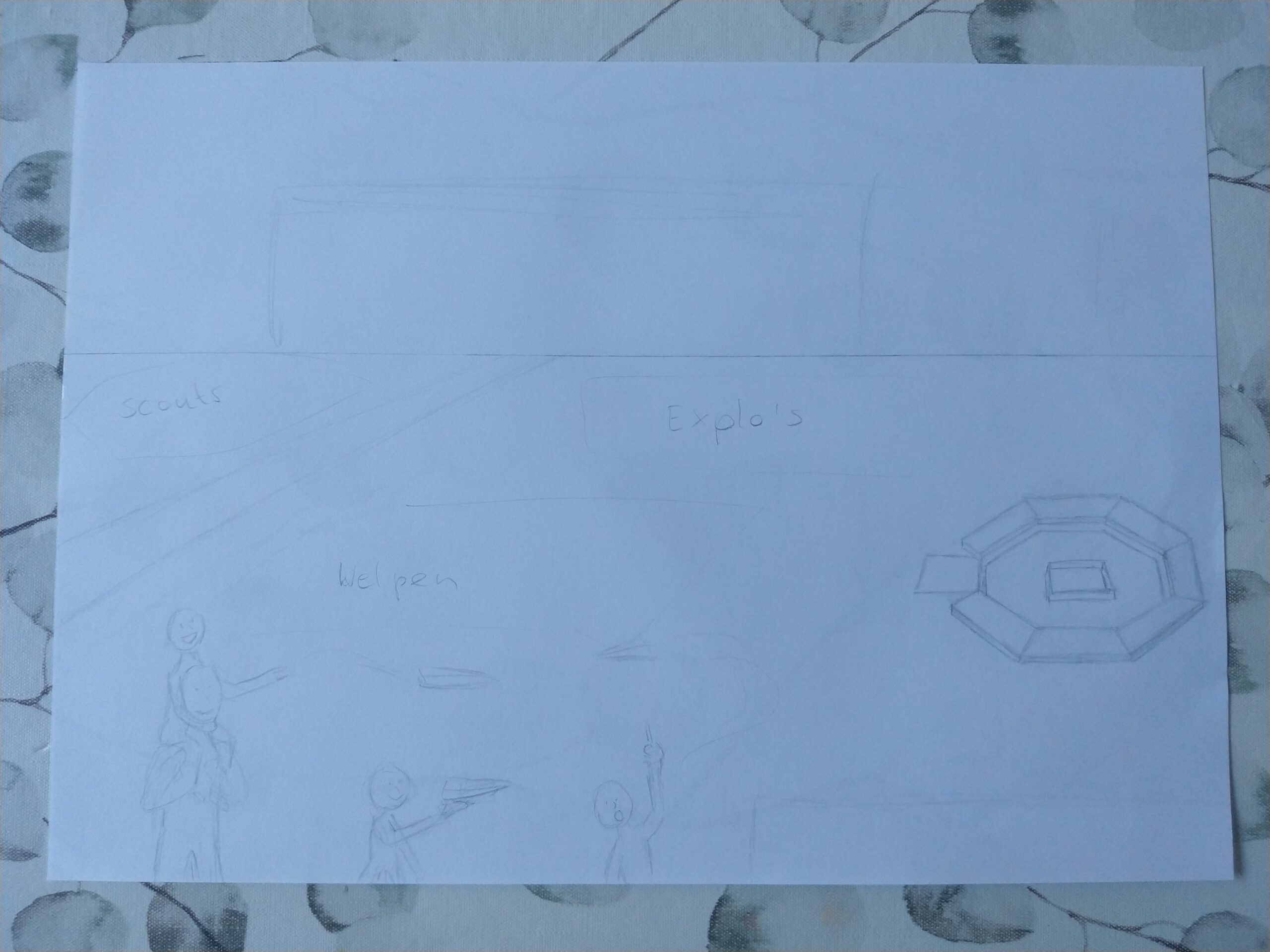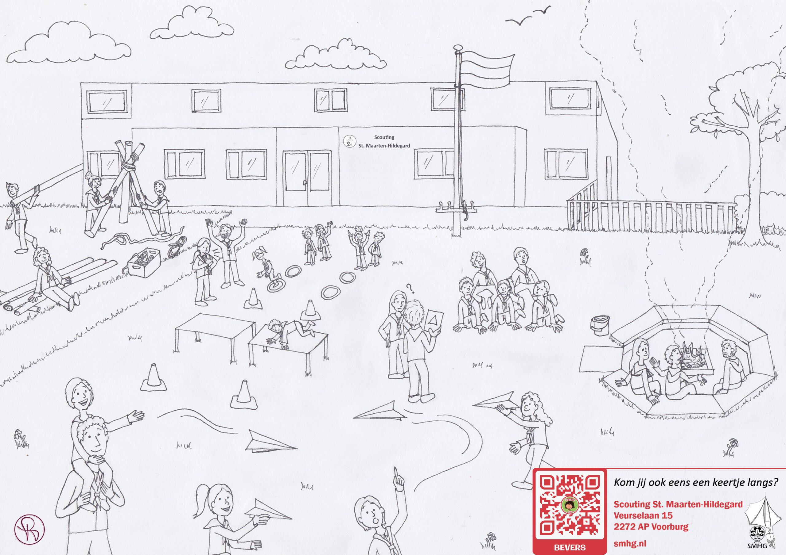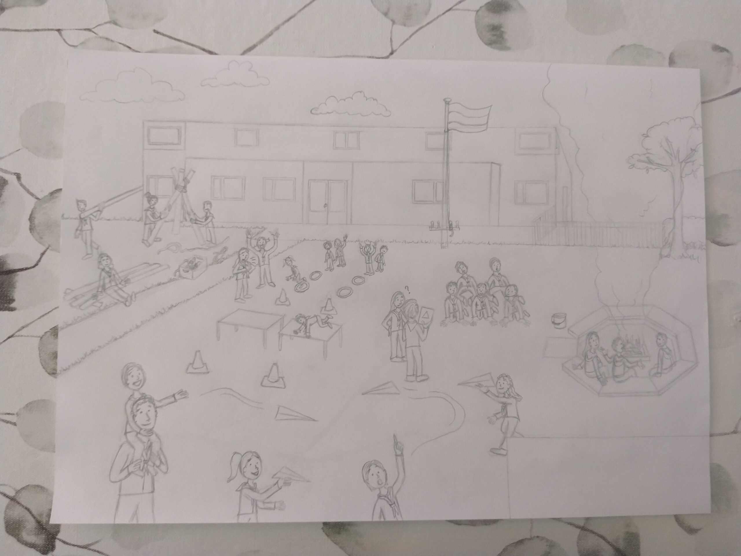 Ik wilde de belangrijkste speltakken er in verwerken, van Bevers tot en met Pivo’s. Dit zijn de leeftijden van 5 tot en met 23 jaar. Iedere speltak heb ik een activiteit laten doen die goed bij die leeftijd past. Het gebouw, de kampvuurplaats en de omgeving heb ik zo goed als na-geprobeerd te tekenen van de realiteit.