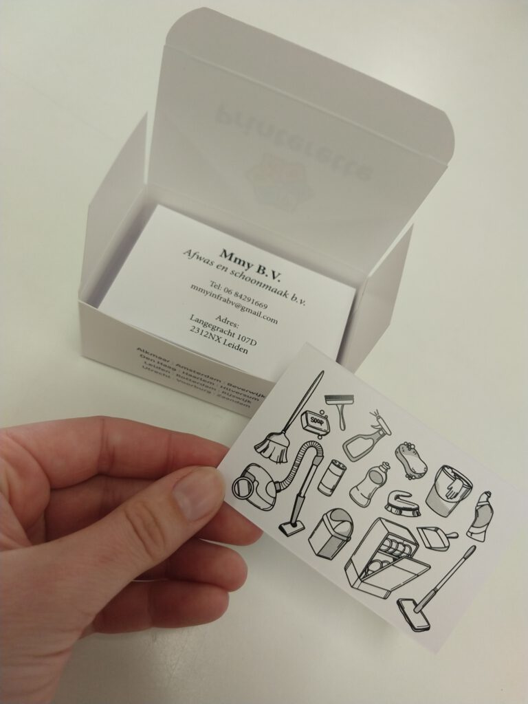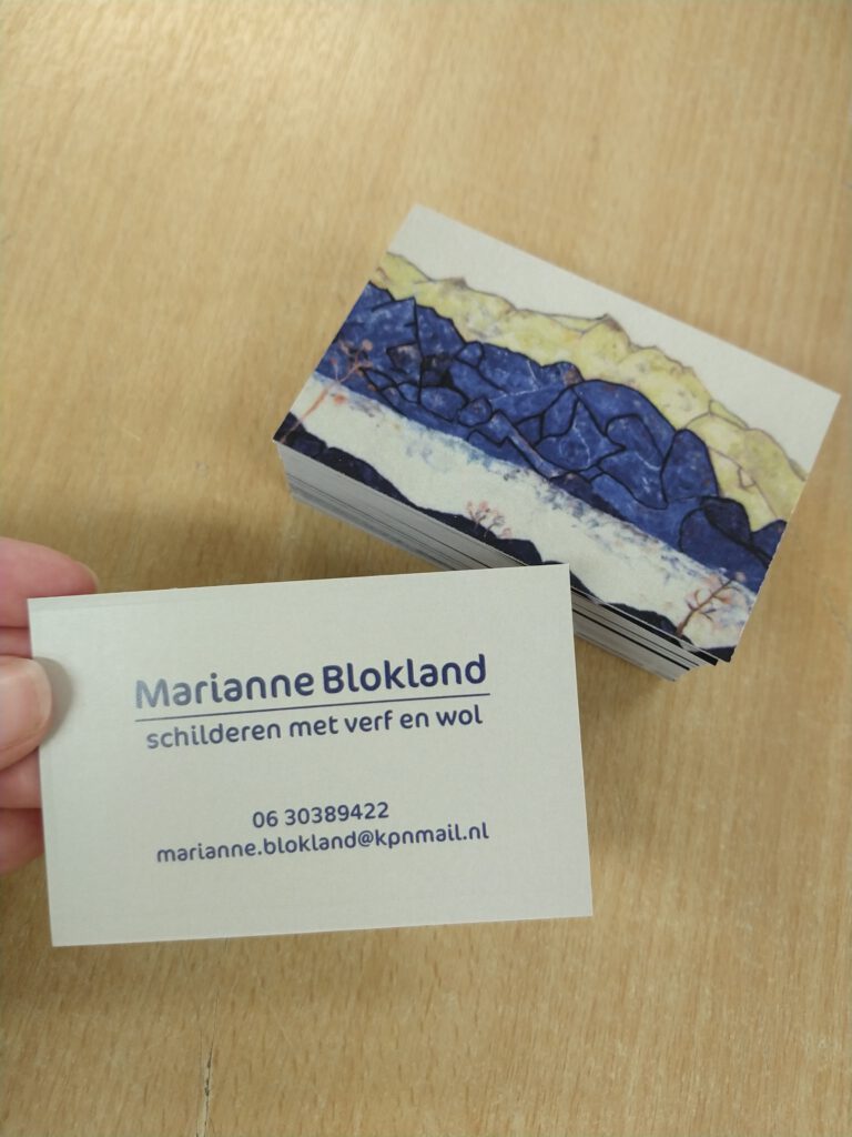 Bij de Printerette heb ik een aantal visitekaartjes zelf mogen ontwerpen. Dit was erg leuk om te doen. De klant geeft de informatie die ze er op willen hebben en deze verwerk je overzichtelijk in het visitekaartje. De klanten wilden het beiden vrij simpel houden, maar wel dat het de aandacht trekt. De kaarten zijn ontworpen in Indesign. Voor de visitekaart van Mmy B.V. heb ik beelden van een rechtenvrije website gebruikt. Bij de visitekaart van Marianne Blokland heb ik haar eigen kunst gebruikt als eyecatcher.